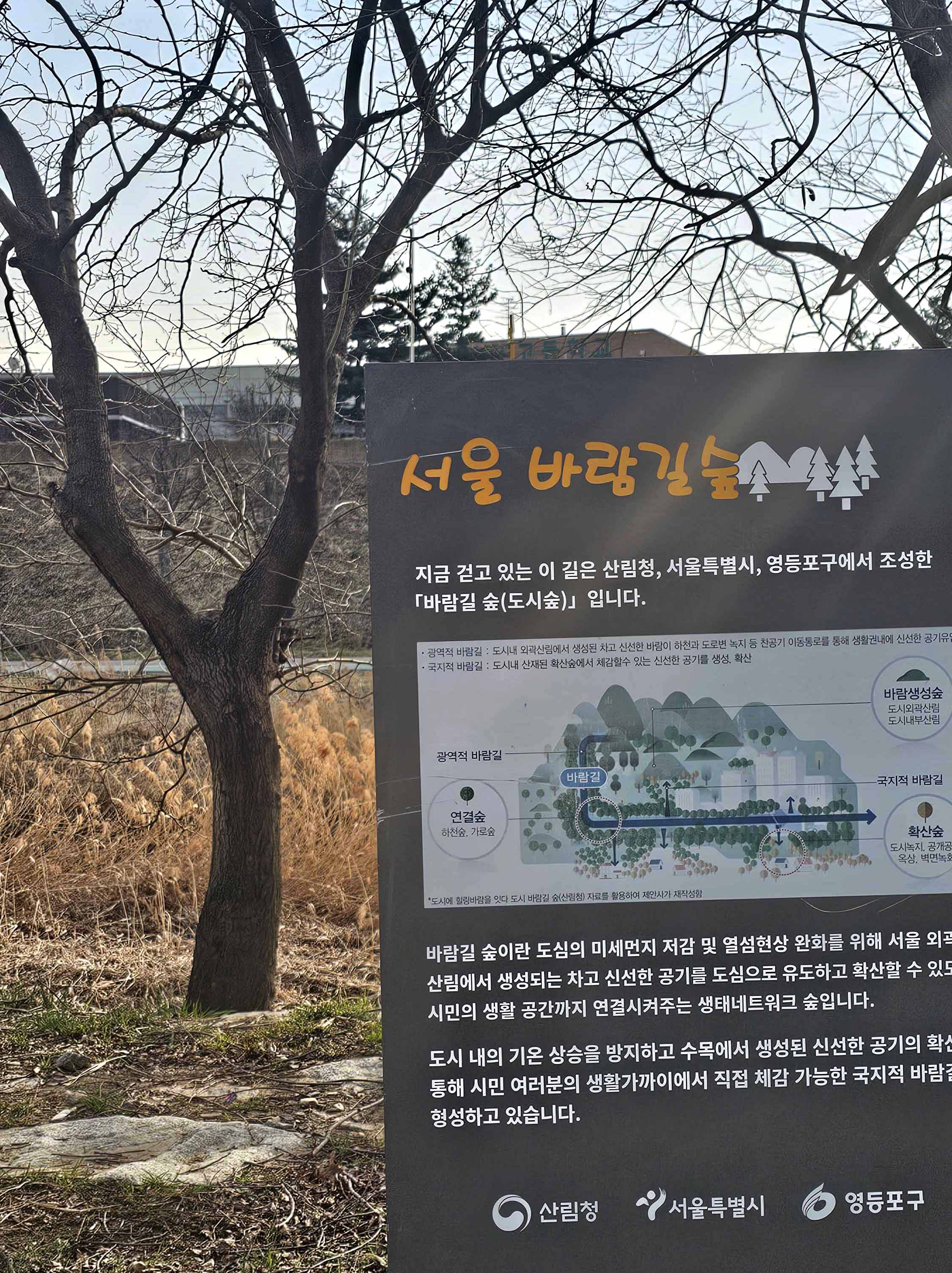 서울 바람길숲 안내판. 산림청·서울시·영등포구가 조성한 도시숲이다.